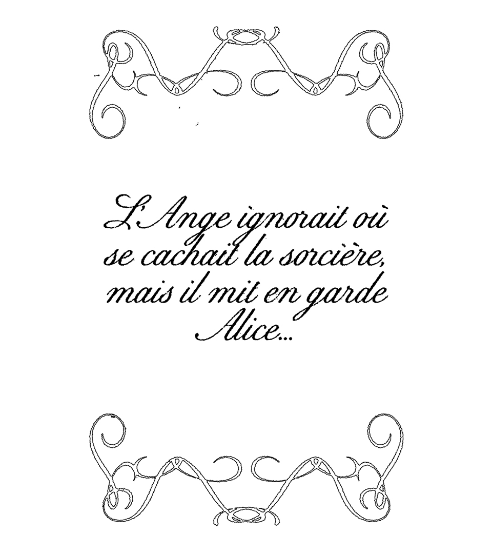 L’Ange, percevant son désarroi, la rassura en lui affirmant que leur rencontre n’était pas le fruit du hasard. Elle était arrivée jusqu’ici pour une raison et elle devait suivre son instinct. Alice, emplie d’un nouvel espoir, remercia l’Ange pour ses paroles réconfortantes.